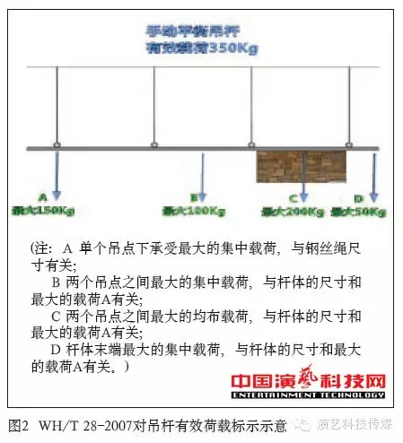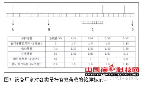 作为舞美装置专业,除需要了解剧场舞台机械设备的基本配置外,还应对设备的基本结构、技术参数、安全装置原理有所了解,才能合理地应用舞台机械设备配合演出使用。以舞台上常用的吊杆为例,不同载荷的吊杆,因吊挂荷载的性质不同,如点荷载、线荷载,吊挂的位置不同,其允许吊挂的荷载分布也不一样,一般专业的舞台机械设备厂家会在舞台醒目位置明示上述内容,见图2、图3。舞美布景的不当吊装使得杆体变形,有时会造成吊挂布景和灯具在运行中碰撞的现象发生。